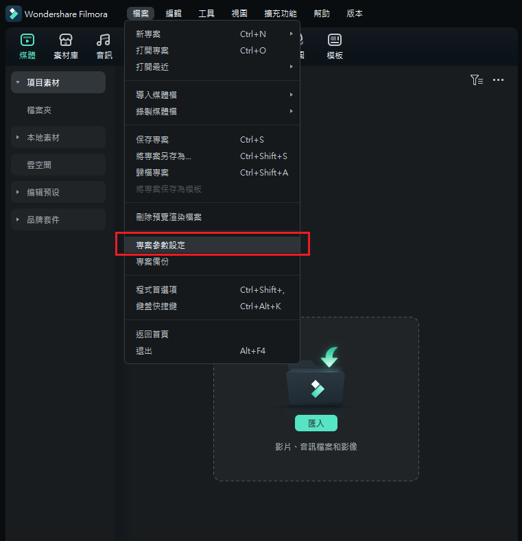 在開始剪輯前,點選上方選單的【文件】→【項目參數設置】。