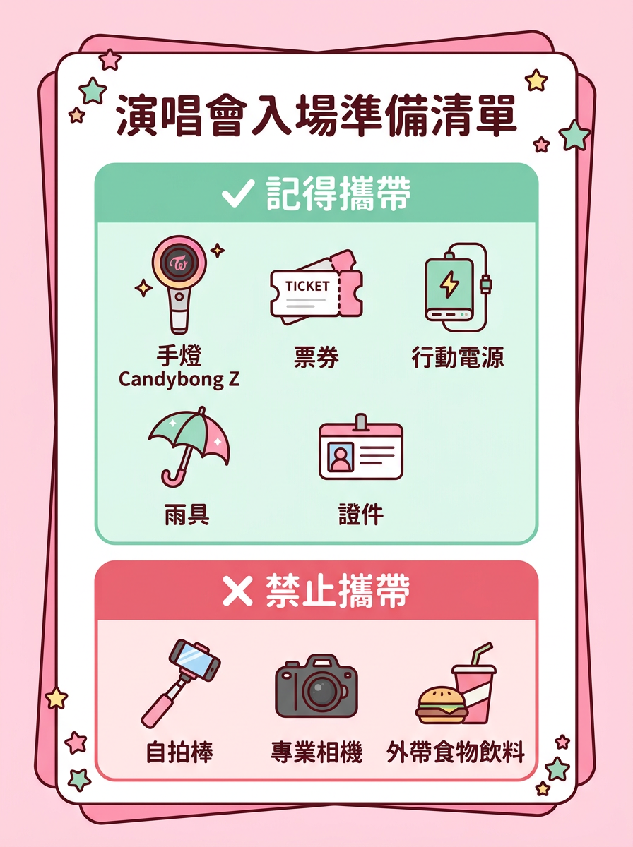 建議準備官方手燈 Candybong、票券、行動電源、簡易雨具,以及你最舒服又最想拍照的演唱會穿搭。
