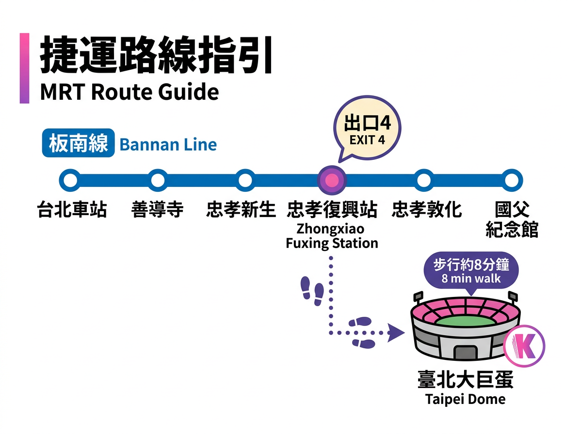 最推薦搭捷運板南線至忠孝復興站,再步行前往。演唱會日建議提早 60–90 分鐘出發,並盡量避免自行開車。 -
