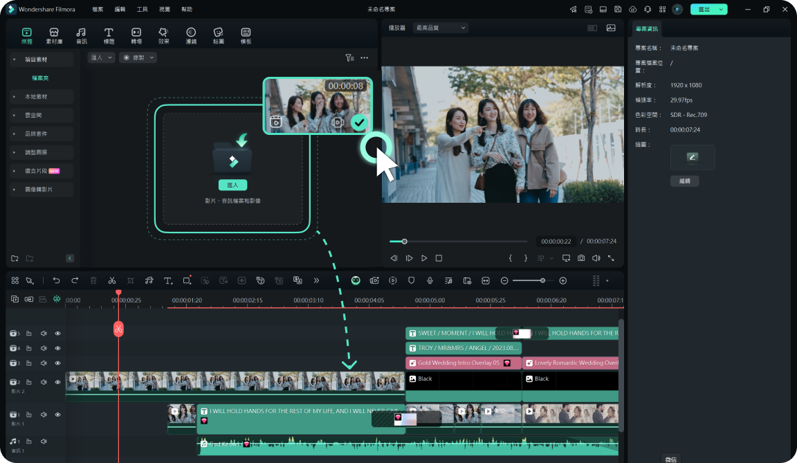 輕鬆地排列、修剪和調整多個影音軌道的時序,讓您精準同步音訊與畫面。這種靈活性不僅提供了無縫的媒體元素轉場,還能確保整體效果流暢自然。此外,您可以即時預覽編輯效果,了解各元素如何互動,隨時調整以完美呈現您的專案。